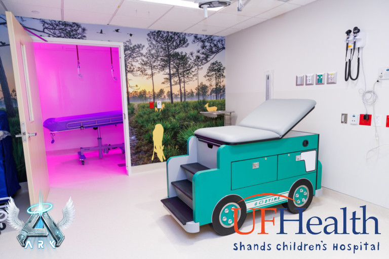 UFヘルス・シャンズは先日、子どもたちとその家族を念頭に置いて設計された、全面改装された小児科・外科フロア「ユニット44」の開院式を行いました。このユニットには、家族向けのハイテク設備を備えた最新の個室、兄弟姉妹のための専用の集いのスペース、そして4台の大型テレビを備えた幼児・ティーン向けの真新しいプレイルームが備わっています。患者様は各スクリーンを個別に操作することも、同期させてこれまで見たこともないほど大きなスクリーンでお気に入りのゲームをプレイすることもできます。ARKなどのゲームに飛び込むのに最適です。インタラクティブなヒーリングウォールとアップグレードされた処置室は、患者様の体験をさらに向上させます。3,000万ドルを超えるこの改修は、病院予算、州の歳出、そして民間の慈善団体からの寄付によって賄われました。その中には、チルドレンズ・ミラクル・ネットワーク・ホスピタルズの支援者(皆さんです!)からの400万ドルを超える寄付も含まれています。